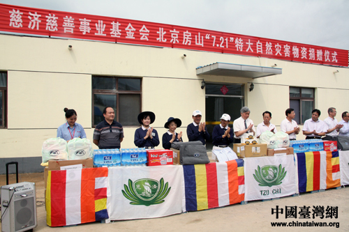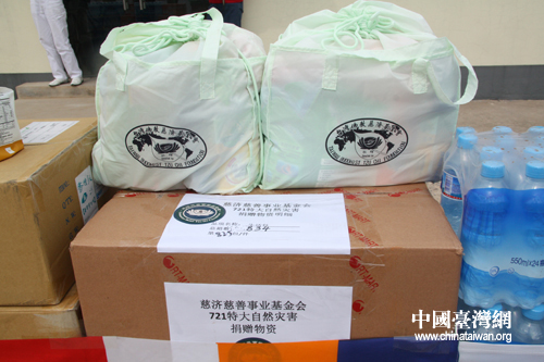 中国台湾网7月30日北京消息??5000个生活用品包、250箱香积饭、5000条毛毯、15000件全新衣服、5000箱方便面、5000箱饮用水……今天上午,在北京房山区张坊镇柿子加工厂的大院里,整齐码放着台湾慈济慈善事业基金会为房山区灾民送来的救灾物资。据悉,慈济基金会还将后续追加捐助食用油、大米、面粉等生活必需品,以上这些捐助物资总价值约1100万人民币,共惠及14000户房山居民,约40000受灾百姓将得到帮助。
