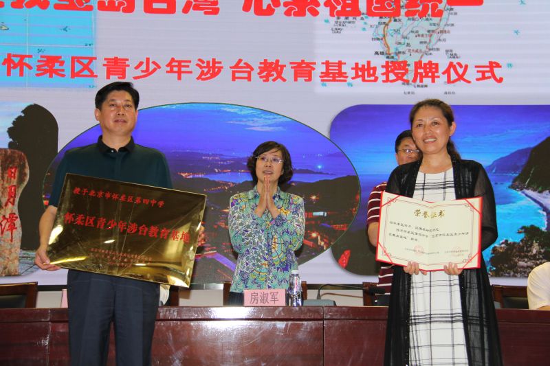 活动中,区台办主任房淑军宣读《怀柔区教委、区台办授予怀柔区第四中学青少年涉台教育基地的决定》,并授予怀柔区第四中学“怀柔区青少年涉台教育基地”称号,并为怀柔四中授牌、颁发荣誉证书。