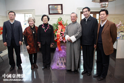 全国政协副主席、台盟中央主席林文漪,台盟中央副主席黄志贤,秘书长张宁,“育青食品”董事长黄梅邨等合影。(中国台湾网 王怡然 摄)