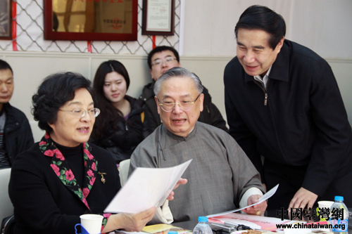 黄梅邨先生向林文漪、黄志贤展示他精心准备的新年礼物。(中国台湾网 王怡然 摄)