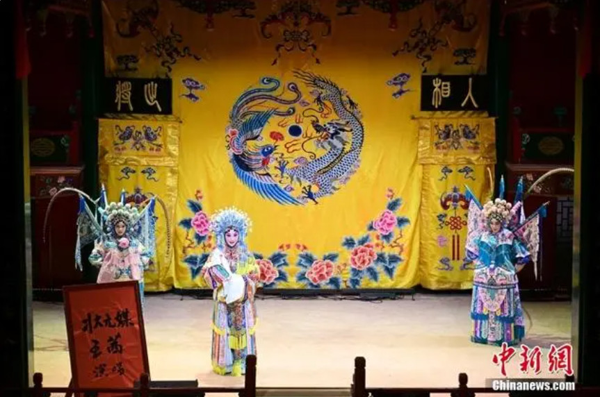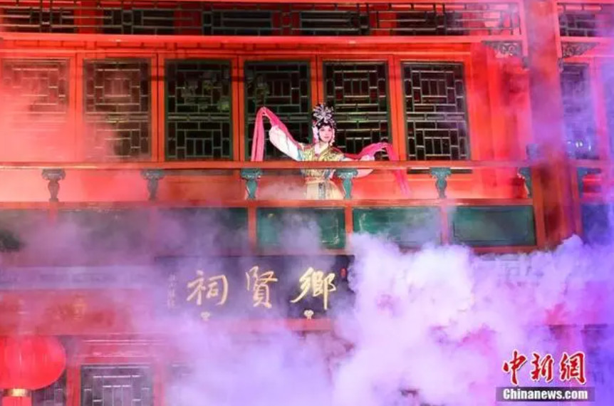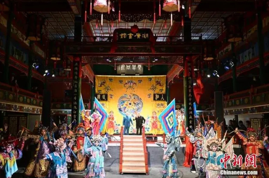 1月5日晚,一场寓意万事诸顺的京剧“开台”,奏响“会馆有戏”之北京湖广会馆焕新华章,历经一年半修缮的北京湖广会馆正式亮相。北京湖广会馆始建于1807年,是国家级重点文物保护单位,集会馆文化、戏曲文化、士人文化于一身,是北京现存拥有戏楼的重要会馆之一。图为启幕仪式。中新社记者 田雨昊 摄