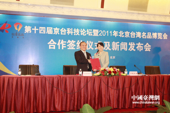 北京市商务委负责人(右)与台北世贸中心负责人(左)就2011年北京台湾名品博览会合作签约(中国台湾网 陈宁 摄)