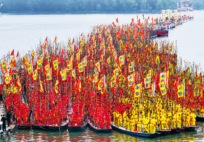 2024年4月6日,泰州姜堰溱潼会船在江苏省泰州市姜堰区溱湖国家湿地公园开幕,数百条各式各样的船只和上万名会船选手云集溱湖,飞篙走桨,奋勇争先,呈现“千篙万桨闹溱湖,百舸争流逐春潮”的壮观场景,演绎历久弥新的民俗画卷。溱潼会船由南宋相沿至今,历经数百年传承,被列入国家级非物质文化遗产名录。图为当日参加溱潼会船表演的船只在湖面上整装待发。 新华社发 顾继红/摄
