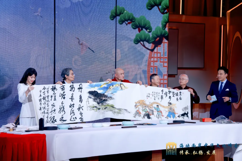 在活动的最后一个单元,中国国家画院一级美术师、中国国家画院国画院研究员史国良,中国人民大学艺术学院教授、博导,郑州大学书法学院院长郑晓华,台湾文联台湾书法家协会会长沈荣槐,台湾中国美术协会理事长李沃源等四位书画名师现场共绘长卷,抒发“两岸一家亲”“两岸书画同根同源”的同胞情怀!
