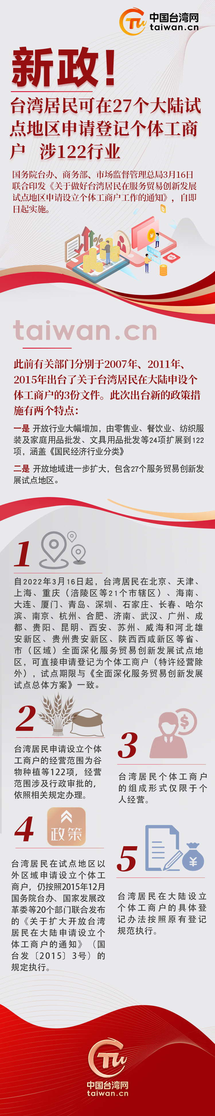 新政!台湾居民可在27个大陆试点地区申请登记个体工商户 涉122行业